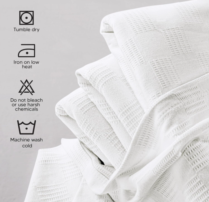 যত্নের নির্দেশাবলী – ওয়াফেল বুনন কম্বলগুলি সহজেই ধোয়া যায়, কারণ এটি সুতির কাপড়। কঠোর রাসায়নিক ব্যবহারের প্রয়োজন নেই। এগুলি শুকিয়ে বা শুকানোর জন্য ঝুলিয়ে রাখা যেতে পারে। সর্বোত্তম ফলাফল পেতে, প্রথম ব্যবহারের সাথে সাথে আলাদাভাবে ধোয়ার পরামর্শ দেওয়া হয়।